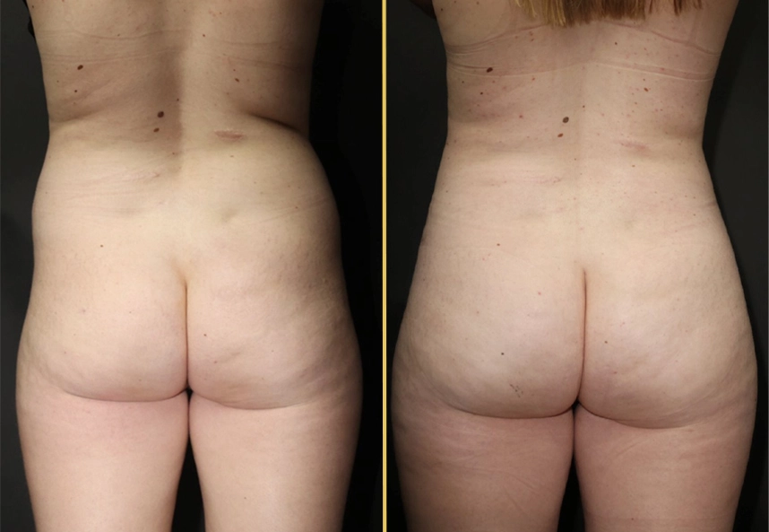 • Note: This patient came to us seeking a fuller and more even buttock. She had an untreated hematoma from an injury after falling which left her rear uneven and not the smooth shape she desired. We achieved these full and balanced results by performing liposuction of the upper and lower abdomen, waist, and hips. We removed 1400cc of fat and reinjected it all back into her buttocks and hip dips (700cc.side) giving her that beautifully smooth shape she was seeking.