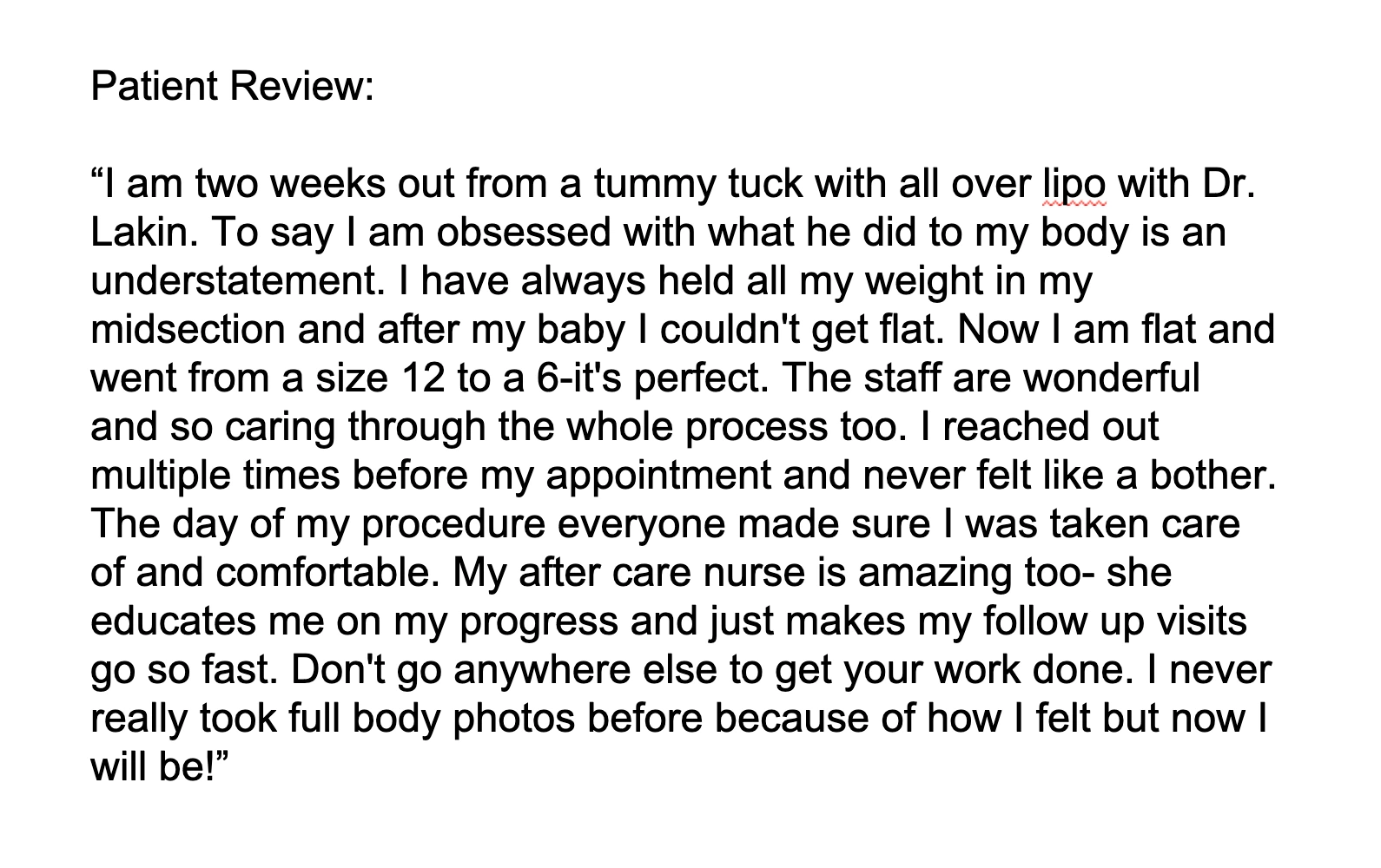 • Areas Treated by Liposuction: upper abdominal midline, waist, front & back bra rolls, upper & lower back