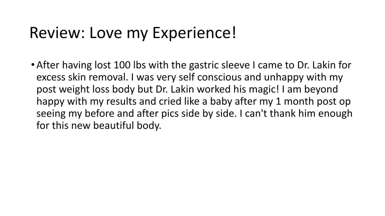 • Goal: wanted to get rid of excess skin after massive weight loss of 100 pounds